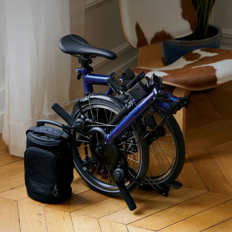Electric C Line — The classic steel frame Brompton with pedal assist. Removable battery bag makes charging easy. Offered in 4- or 12-speed.