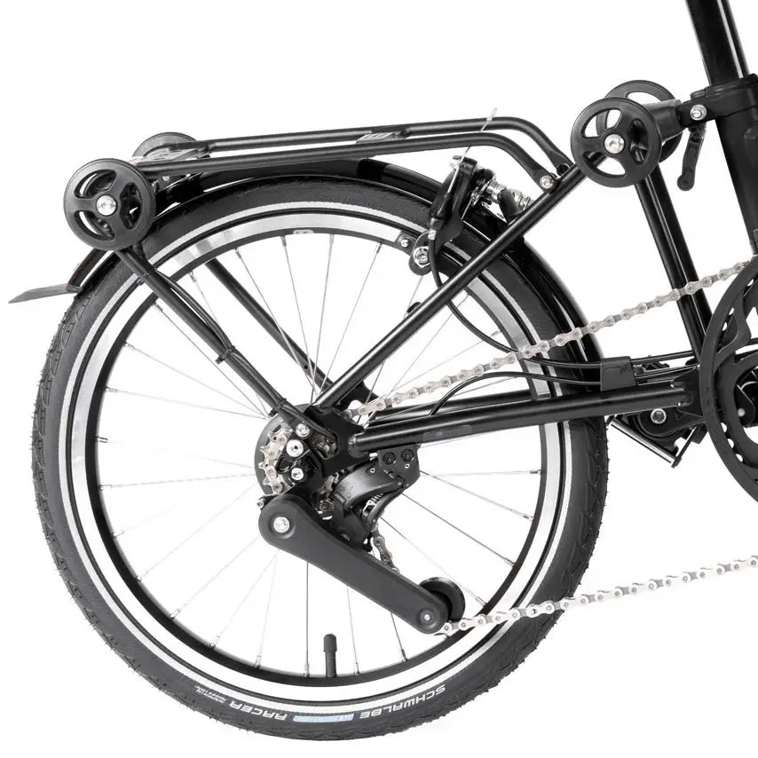 When you can’t ride, roll. Four little roller wheels keep your folded Brompton upright and easy to wheel along—no lugging required. Add a bag on top for extra carrying space. The rack can be fitted at any time, even after purchase.