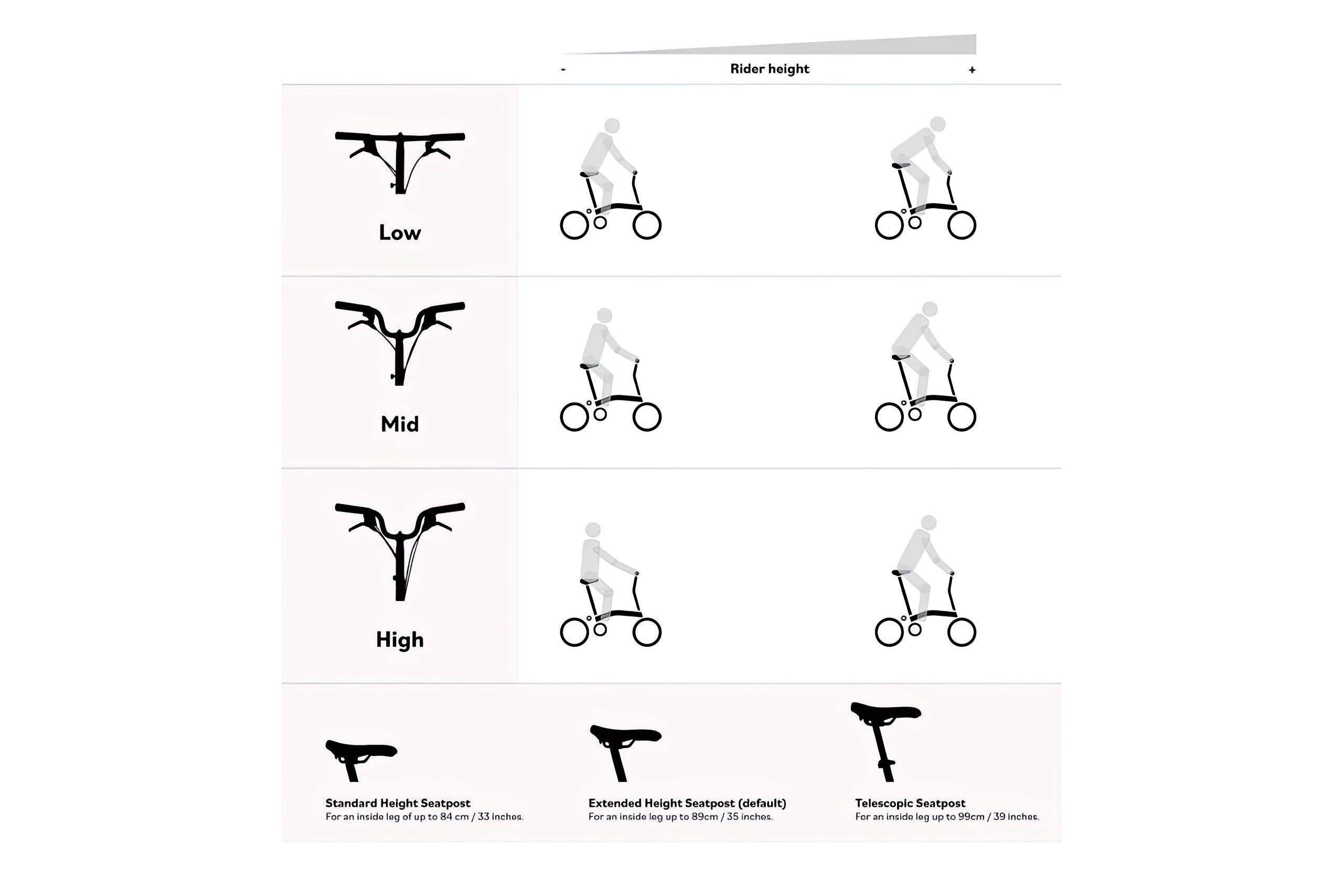 Tallest option. Upright comfort with light steering. Great for taller riders or anyone who prefers not to lean forward.