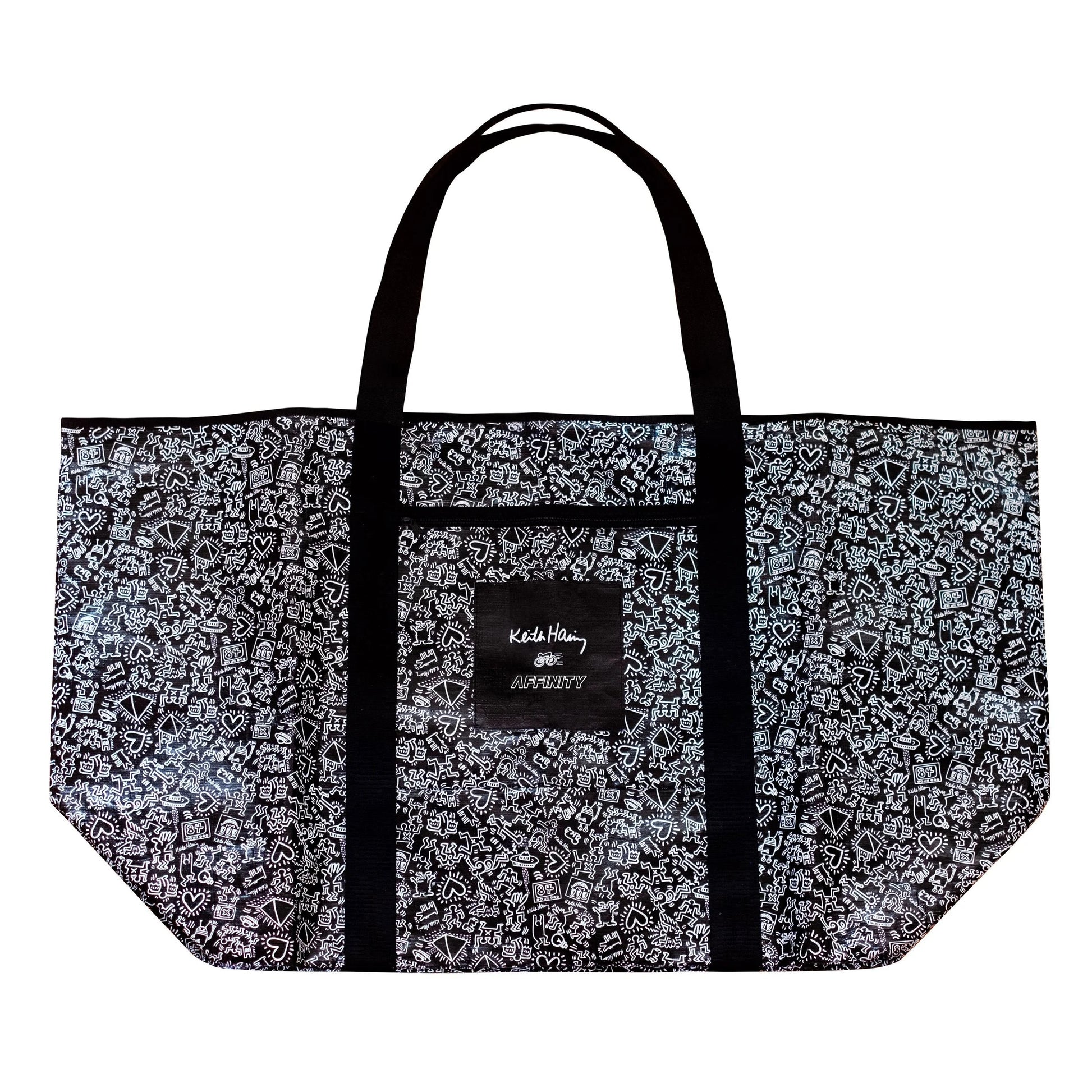 The white-washed birch panel frame is finished with vibrant, water-based screen-printed Keith Haring graphics. It also includes an oversized, lined ripstop tote bag with all-over graphics plus a matching bike stand for storage at home.