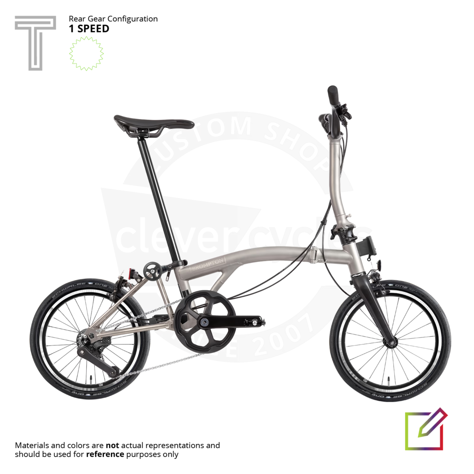 This is the factory Brompton T Line—the lightest, most refined platform Brompton has ever built, and the ultimate foundation for a truly custom ultralight build. With its titanium frame, carbon components, and three different gearing options, the T Line is designed for riders who prioritize effortless portability, fast folding, and a crisp, responsive feel on every city ride.