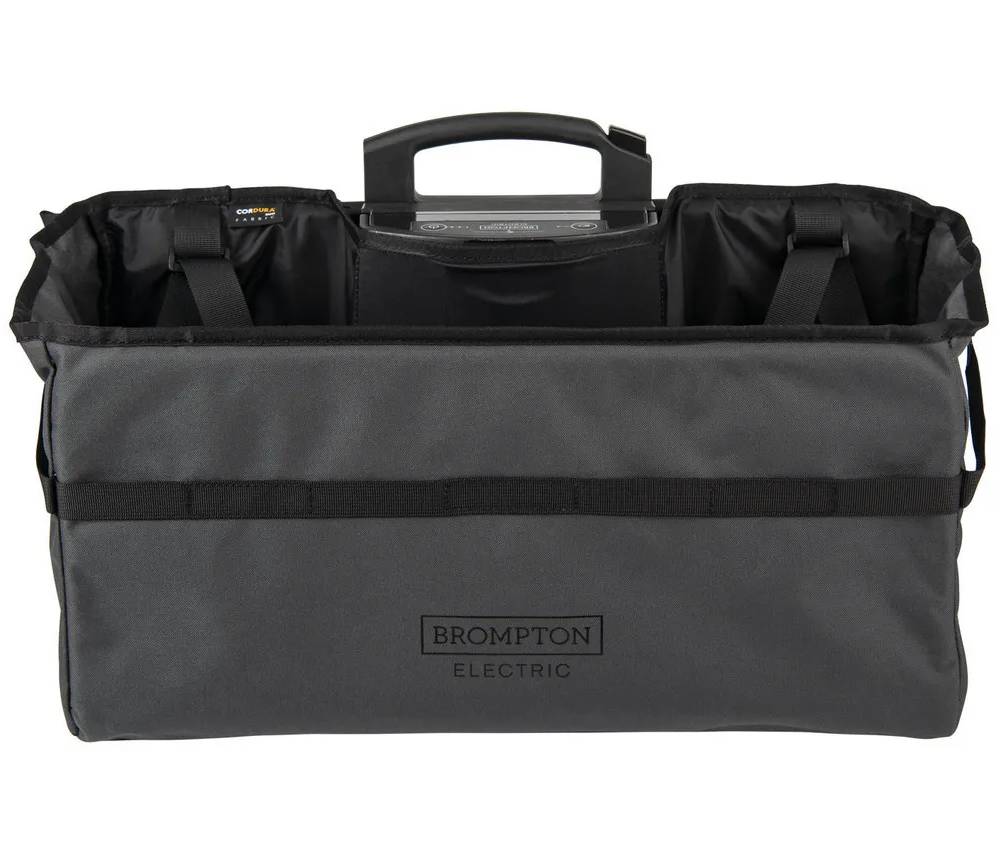 The Brompton Electric Basket Bag has an internal zipped pocket, perfect for holding your phone or wallet. The external webbing loop allows you to attach additional items, like your helmet, when you reach your destination. The internal aluminum brace and side cinches enable you to adjust the bag size and close the top opening quickly and tightly. It’s made from premium, durable materials, making it reliable like a best friend.