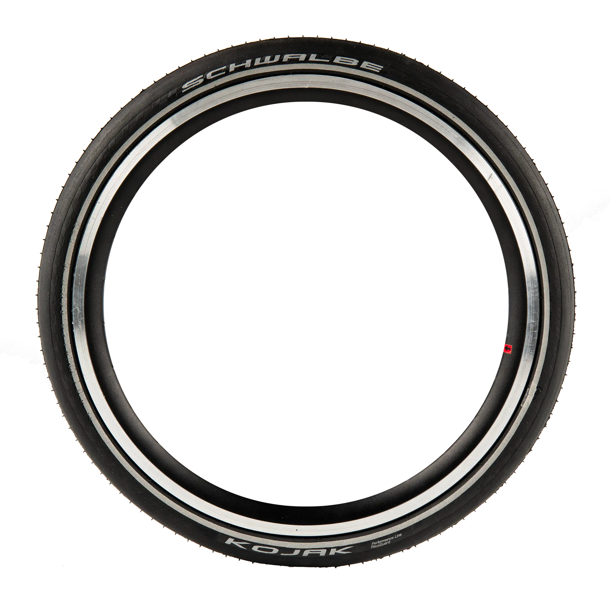 The Brompton Schwalbe Kojak is the lightweight, performance-oriented tire for riders who prefer speed and agility. With its slick tread, folding Kevlar bead, and reflective sidewall, it delivers a fast, responsive ride while maintaining practical safety for city use.