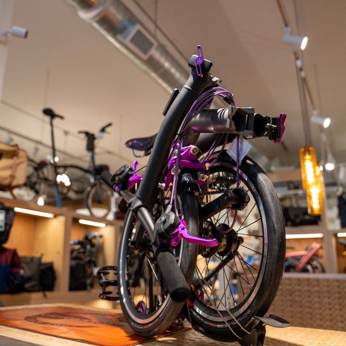 Powered by Brompton's wide-range 12-speed drivetrain featuring White Industries purple and black components, you can go crazy on the climbs and party like it's 1999 on the flats. Smooth, crisp shifting keeps every ride in perfect rhythm, whether you're cruising through city streets or chasing that electric night energy.