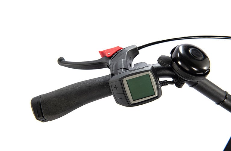 The three-wheeled design provides a lower center of gravity and a wider stance than a traditional bicycle, making it less likely to tip over. A low step through design allows the rider to easily mount and dismount without swinging legs over a high bar. The trike includes a front V-Brake with parking brake and rear coaster brake. Front and rear lights are powered by the motor battery.