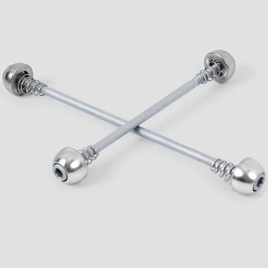 Constructed with chromoly axles and stainless steel springs, the AxleRodz deliver reliable performance for commuters, touring riders, and anyone parking their bike in public spaces. The lightweight design adds only 69 grams per pair while providing enhanced security over traditional quick-release systems. Compatible with vertical dropout frames, these skewers offer an affordable alternative to more expensive wheel security systems without requiring frame modifications or specialized tools beyond a standard 5mm Allen key.