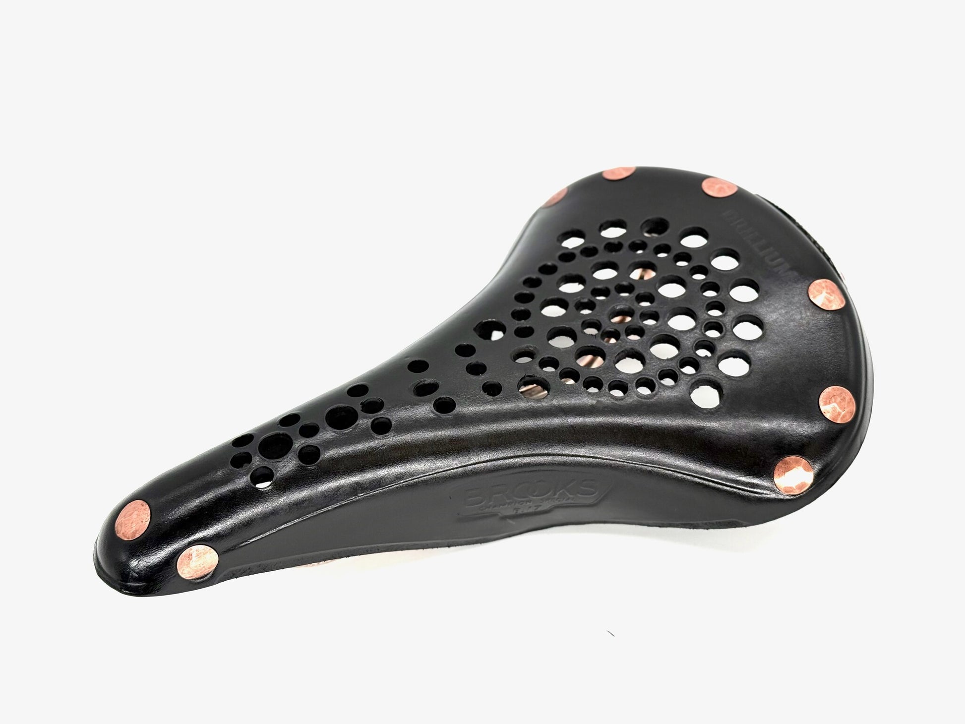 Our Brooks Drillium Saddle is our custom take on the legendary Brooks leather saddle. We take an authentic Brooks saddle and precision-drill a series of holes, reducing weight while adding a distinctive, vintage aesthetic.