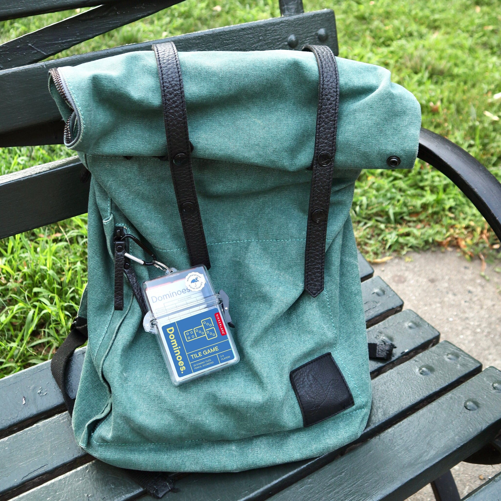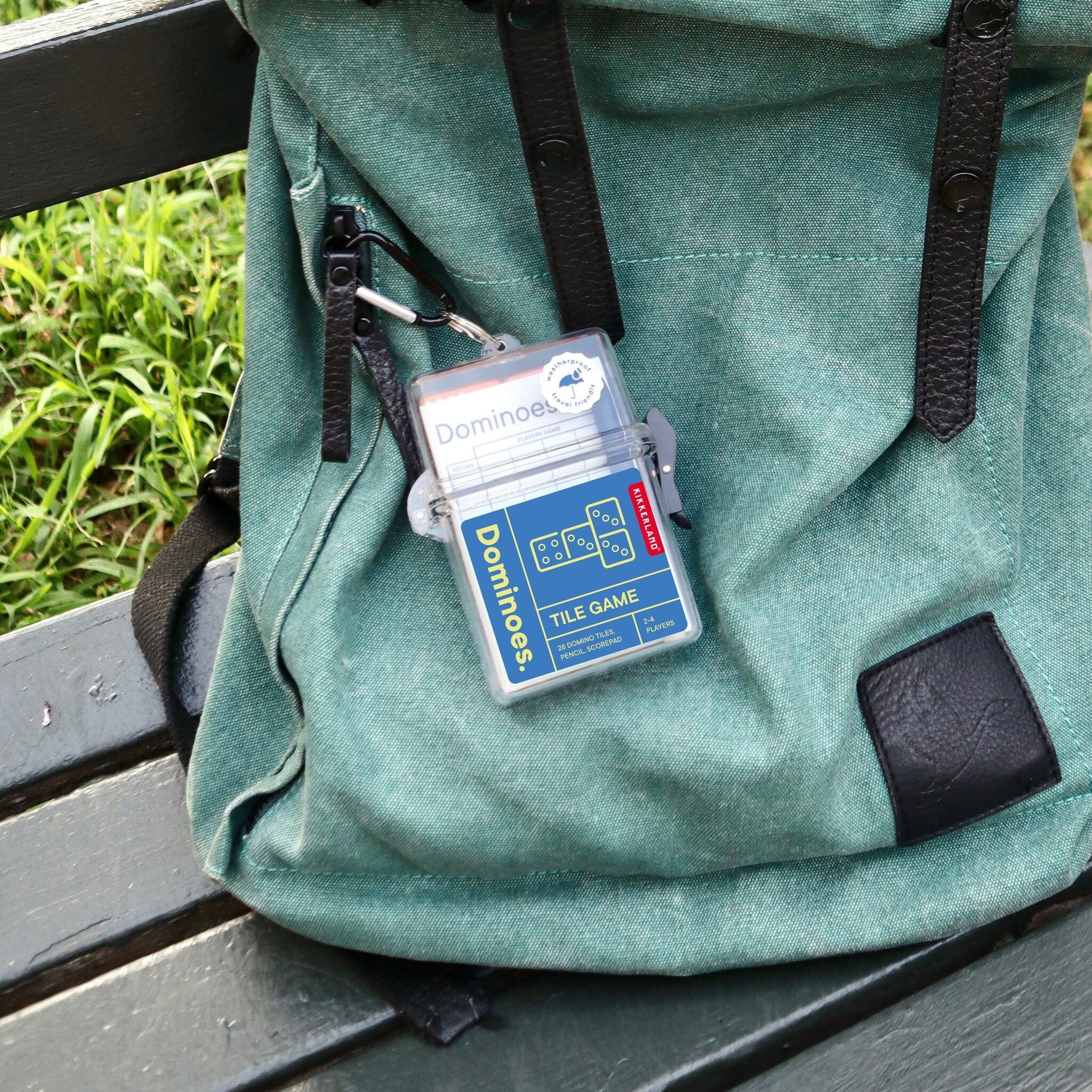 Inside you’ll find 28 durable tiles, an everlasting pencil, a stone paper score pad, and clear game instructions. The whole kit is sealed with a clip closure and rated IPX5 to handle splashes and showers, with a built-in carabiner so you can clip it to a bag, belt loop, or cargo bike rail.