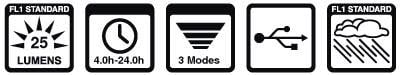 - 3 Modes (burn time): Flash (24 hrs), Pulse (5 hrs), Steady (4 hrs)