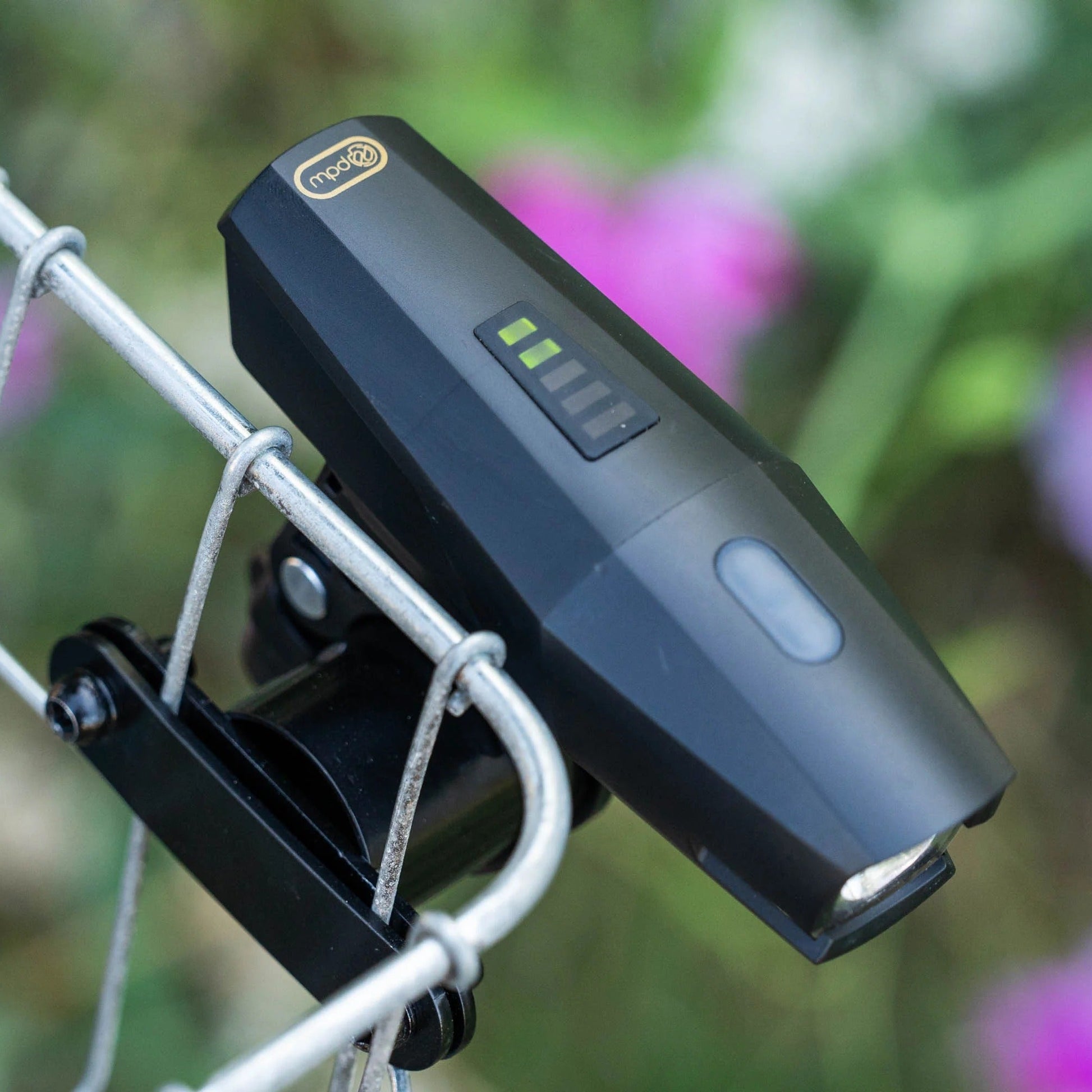 A top-mounted battery meter shows remaining charge at a glance, and the Mission Control III handlebar mount keeps the light rock-solid over rough pavement or gravel. With five practical modes, USB-C charging, and a weatherproof body, this is a set-and-forget headlight made for daily use.