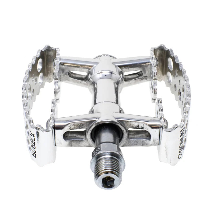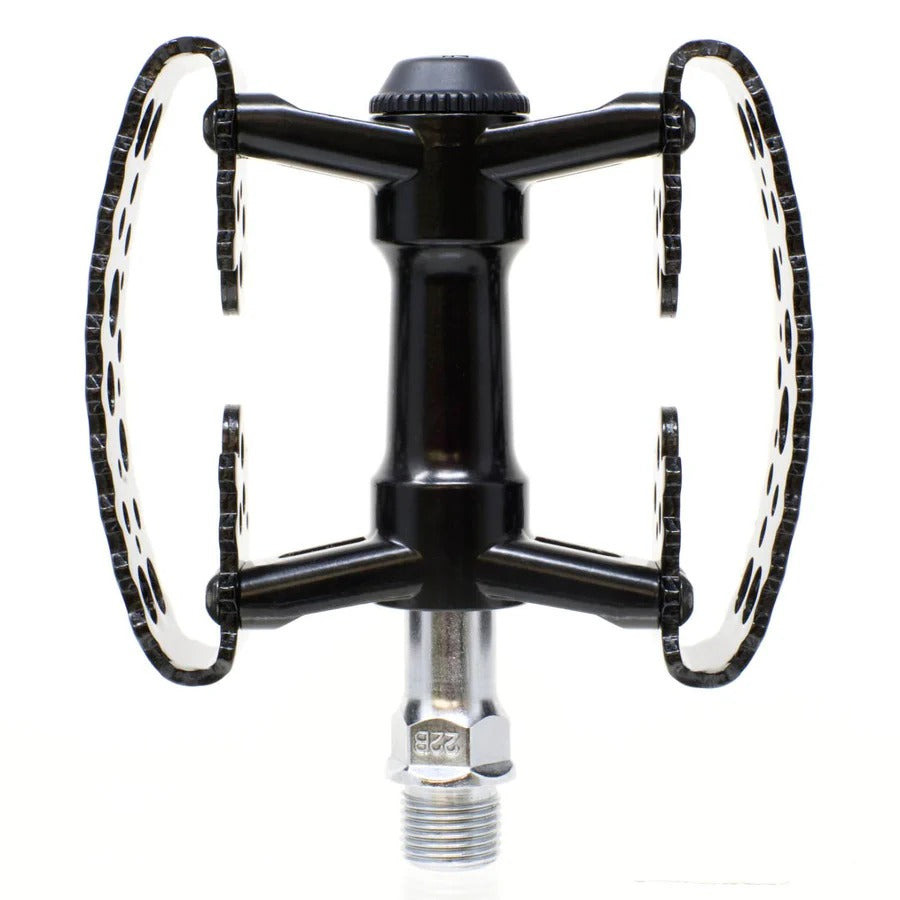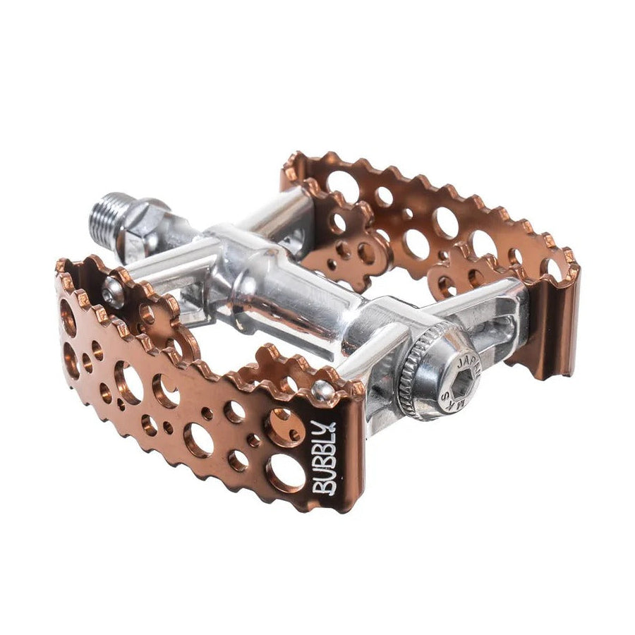 The Tiny Bubbly pedals from SimWorks by MKS shrink the original Bubbly platform into a more compact shape without giving up stability or comfort. The cage keeps the same gently concave profile, so your shoes settle in naturally and stay planted whether you are cruising across town or spinning through a long day on tour.