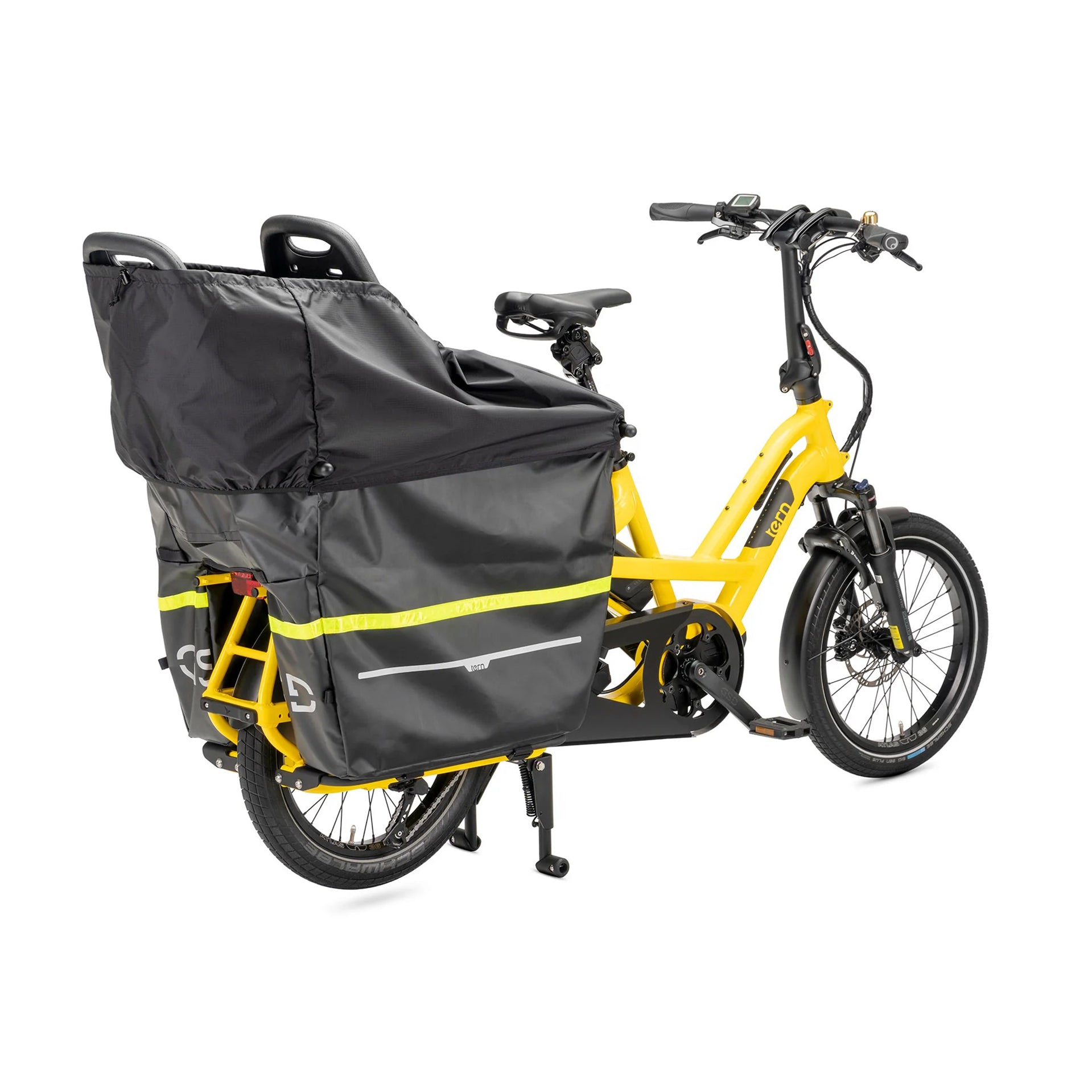 The Tern Storm Box turns the rear of your GSD Gen 2 into a big, weather-protected bucket that works just as well for school runs as it does for grocery missions. Wrapped around the Clubhouse+ and sitting over the Sidekick Wide Decks, it creates a deep, soft-sided compartment that keeps gear contained and small passengers riding low and secure.
