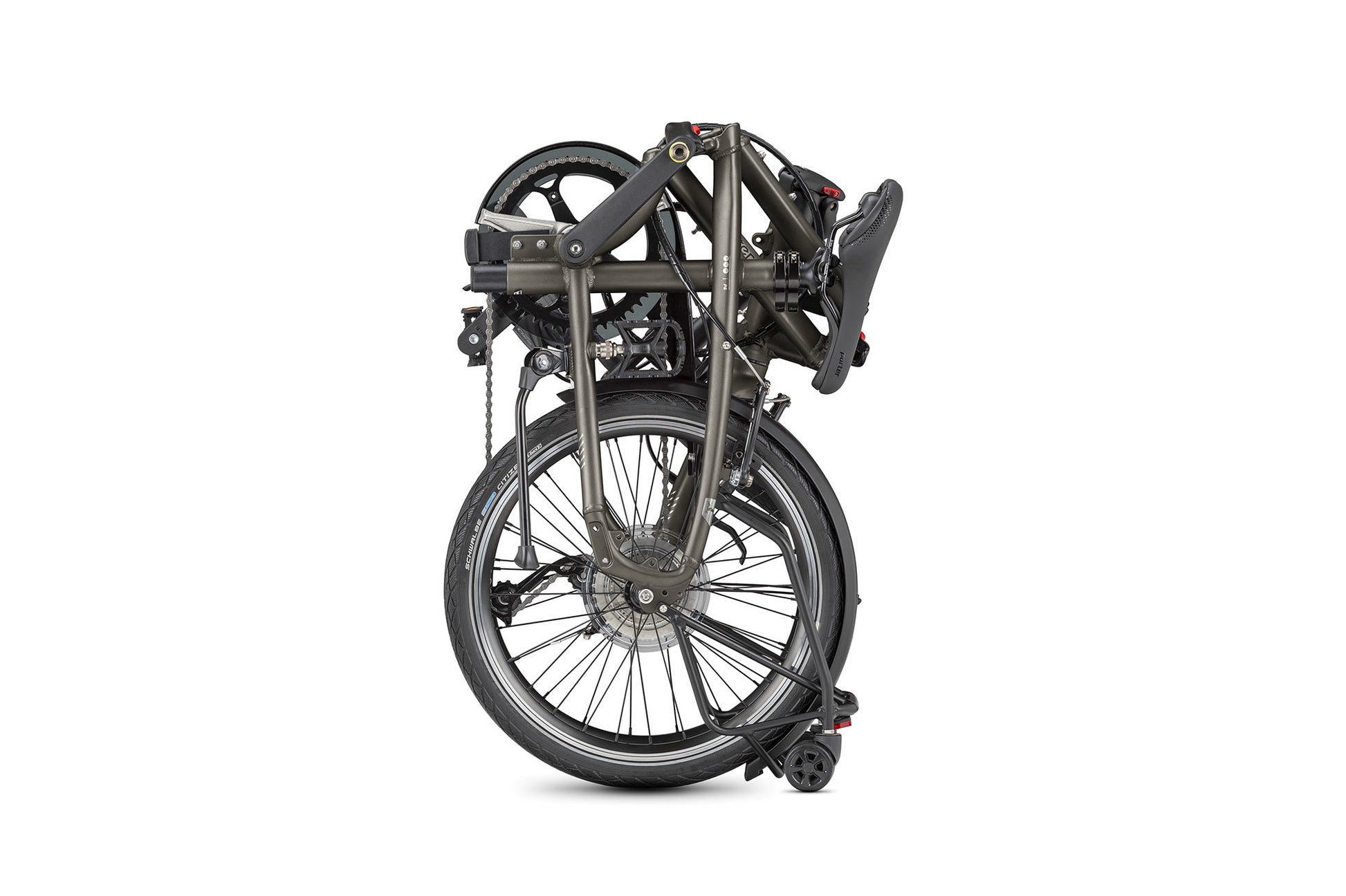 The Tern BYB P8 impresses with its compact folding design and reliable performance. Its 20" wheels offer stability akin to larger bikes while securely folding into a size that can fit into tight spaces. The robust frame and quick-rolling tires provide a ride reminiscent of a flat-bar road bike ramping up your confidence on every trip.This model is compact, folding down to 13.8 × 31.9 × 20.5 inches, perfect for stowing in lockers or closets. The Metro Transit Rack features built-in spinner wheels, making it a breeze to transport. With an adjustable handlepost and seatpost accommodating riders from 4’10” to 6’5”, it’s easy to achieve a comfortable fit. Carrying it upstairs is hassle-free with the Tern Porter saddle slinging over your shoulder. Plus, the versatile 8-speed drivetrain enhanced by Shimano’s Acera shifter and Shadow derailleur lets you tackle varied terrains with ease.