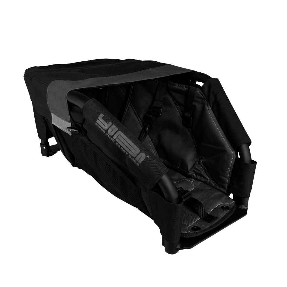 The Yuba Wooftop turns the rear rack of a Yuba longtail into a dedicated space for your dog, so they can come along for everyday rides without perching in a front basket or jangling around in a box. A rigid frame and hammock-style base create a stable, supportive “den” where your dog can lie down and relax while you handle the riding.